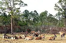 Elands prefer to live in semiarid areas that contain many shrub-like bushes, and often inhabit grasslands, woodlands, subdesert, bush, and mountaintops with altitudes of about 15,000 ft (4,600 m).[21] Elands do, however, avoid forests, swamps and deserts. The places inhabited by elands generally contain Acacia, Combretum, Commiphora, Diospyros, Grewia, Rhus, and Ziziphus trees and shrubs; some of these also serve as their food.