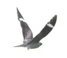 Like other members of the caprimulgid clan, the nighthawk's ground nesting habits endanger eggs and nestlings to predation by ground carnivores, such as skunks, raccoons and opossums.[21] Confirmed predation on adults is restricted to domestic cats, golden eagles, and great horned owls.[22] Peregrine falcons have also been confirmed to attack nighthawks as prey, although the one recorded predation attempt was unsuccessful.[23] Other suspected predators are likely to attack them, such as dogs, coyotes, foxes, hawks, American kestrels,[24] owls, crows and ravens, and snakes.[25]