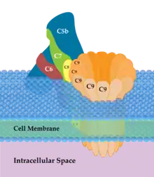 MAC is composed of a complex of four complement proteins (C5b, C6, C7, and C8) that bind to the outer surface of the plasma membrane, and many copies of a fifth protein (C9) that hook up to one another, forming a ring in the membrane. C6-C9 all contain a common MACPF domain.[6] This region is homologous to cholesterol-dependent cytolysins from Gram-positive bacteria.[7]