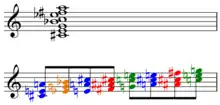 More precisely, the complexe sonore is Igor Stravinsky's use of diatonic and whole tone motifs, and scales, against an octatonic background, rotated by minor thirds. Stravinsky "considered them to be in a perpetual state of potential symmetrical rotation by minor thirds under which the octatonic background scale is invariant."[3] Dmitri Tymoczko argues that Stravinsky's octatonicism results "from two other compositional techniques: modal use of non-diatonic minor scales, and superimposition of elements belonging to different scales."[4]