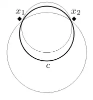 ![]() Two points outside c (thick circle) are sufficient to prevent a larger circle not containing them from including it |