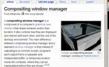 Implementing compositing under the X Window System required some redesign, which took place incrementally.[15] Metacity 2.8.4 was released in August 2004.[16] However, the first widely publicized compositing window manager for X was Xfwm, released in January 2005.[17] On 26 January 2005 Compiz was released, introducing fully accelerated 3D-compositing to the Linux platform.[18] KDE's KWin also supports compositing.
