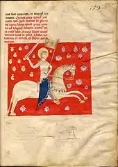 In the 15th century, the red banner which guided the Galician armies to battle, was still preserved in the Cathedral of Santiago de Compostela, in the centre Saint James riding a white horse and wearing a white cloak, sword in hand:[34] The legend of the miraculous armed intervention of Saint James, disguised as a white knight to help the Christians when battling the Muslims, was a recurrent myth during the High Middle Ages.