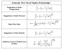 can be obtained, where M is the Mach number and γ is the ratio of specific heats (1.4 for air). See table of isentropic flow Mach number relationships.