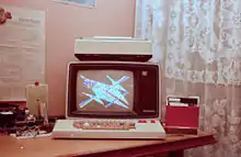 In December 1976,[4] the newly formed Compucolor subsidiary released the Compucolor 8001.[10][11] This was another $1,295 kit that converted an Intecolor 8001 into a complete computer with BASIC on a built-in ROM.[1] When initially booted, the machine starts in "terminal mode" an acts as a glass terminal for its RS-232 port. Pressing Escape+W launches the ROM-based BASIC interpreter, while Escape+P launched the machine code monitor program. It also included a program to aid in aligning the guns in the monitor.[7]