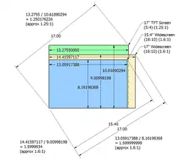 Estimation of monitor size by the distance between opposite corners does not take into account the display aspect ratio, so that for example a 16:9 21-inch (53 cm) widescreen display has less area, than a 21-inch (53 cm) 4:3 screen. The 4:3 screen has dimensions of 16.8 in × 12.6 in (43 cm × 32 cm) and an area 211 sq in (1,360 cm2), while the widescreen is 18.3 in × 10.3 in (46 cm × 26 cm), 188 sq in (1,210 cm2).