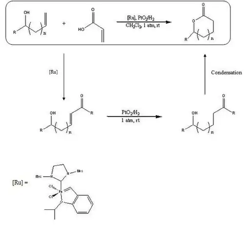 Metathesis has been a powerful tool in the coupling of olefins for several decades. The ability to rearrange carbon-carbon double bonds has provided great utility in all aspects of organic chemistry. Cossy et al. report a simple synthesis to form substituted five and six membered lactones from the cross metathesis of an allylic or homoallylic alcohol and acrylic acid using a ruthenium based metathesis catalyst. Lactones are good synthetic starting points for many natural products and are prevalent structures in biology therefore they are widely utilized in pharmaceuticals.[5]