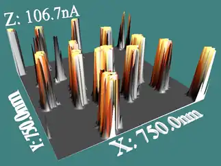 The CAFM is usually operated in contact mode; the tip can be kept at one location while the voltage and current signals are applied/read, or it can be moved to scan a specific region of the sample under a constant voltage (and the current is collected). Recently, some manufacturers provide the option of measuring the current in semi-contact mode.[2] The CAFM was first developed by Sean O'Shea and co-workers at the University of Cambridge in 1993,[3] and it is referred to in the literature by several names, including C-AFM, local-conductivity AFM (LC-AFM), conductive probe AFM (CP-AFM), conductive scanning probe microscopy (C-SPM) or conductive scanning force microscopy (C-SFM), although CAFM is the most widespread.