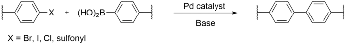 Since 1979, Suzuki coupling has been an efficient method for aryl-aryl bond formation.[3] The reaction conditions of Suzuki coupling for the formation of a biphenyl repeat unit for CMPs include the palladium catalyzed cross-coupling of an organo-boron reagent with an organic halide or sulfonate in the presence of some base. An advantage of using this method to synthesize CMPs is that reaction conditions are mild, there is commercial availability of organo-boron reagents, and the reaction has high functional group tolerance. This method is best used for large scale synthesis of CMPs.[4] A drawback to Suzuki coupling is the reaction being oxygen sensitive, often leading to side products, as well as the reaction needing to be degassed.[2]