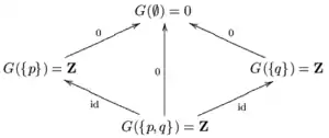 Let be the topological space consisting of two points and with the discrete topology. has four open sets: . The five non-trivial inclusions of the open sets of are shown in the chart.
