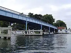 On 17 July 1866 the Cookham Bridge Company announced that a new iron bridge would be built and requested designs. 37 schemes were submitted and the contract was awarded to Messrs Pease, Hutchinson & Co Ltd of the Skerne Ironworks, Darlington for a bridge of two wrought iron girders supported by eight pairs of concrete-filled iron pillars.[7] The estimated cost was £2,520 (equivalent to £248,366[5]), some £1000 cheaper even than the estimate for the 1840 wooden construction. The remarkably low cost, due to Pease & Hutchinson being major iron manufacturers and prolific bridge builders, led to the new bridge being known as "the cheapest bridge on the River for its size".[8]
