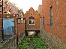 After leaving the River Lee Flood Relief Channel (Horsemill Stream) at Fishers Green the stream flows south to form the western boundary with the former Waltham Abbey Royal Gunpowder Mills before flowing through the Waltham Abbey SSSI within the Gunpowder Mills property. Above Waltham Abbey the stream diverges from the Old River Lea[3] with both channels bordering the Cornmill Stream and Old River Lea, SSSI. The stream passes under the 14th-century Harold's Bridge and the B194 road (Abbey View) before flowing through a sluice in the abbey's grounds. The stream flows underground to emerge adjacent to Waltham Abbey town hall. After flowing through an urban area, it rejoins the River Lee Flood Relief Channel beyond the town of Waltham Abbey. 51°41′23″N 0°00′07″W / 51.689663°N 0.001856°W