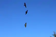 The nesting season starts early, with some birds incubating eggs by early April.[33] American crows build bulky stick nests, nearly always in trees but sometimes also in large bushes and, very rarely, on the ground. They will nest in a wide variety of trees, including large conifers, although oaks are most often used. Three to six eggs are laid and incubated for 18 days. The young are usually fledged by about 36 days after hatching. Predation primarily occurs at the nest site and eggs and nestlings are frequently eaten by snakes, raccoons, ravens and domestic cats. Adults are less frequently predated, but face potential attack from great horned owls, red-tailed hawks, peregrine falcons and eagles. They may be attacked by predators such as coyotes or bobcats at carrion when incautious, although this is even rarer.[29][34]