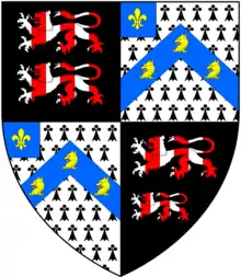 Arms of Fox-Strangways: Quarterly of four: 1st & 4th: Sable, two lions passant paly of six argent and gules (Strangways); 2nd & 3rd: Ermine, on a chevron azure three fox's heads and necks erased or on a canton of the second a fleur-de-lys of the third (Fox).[1]