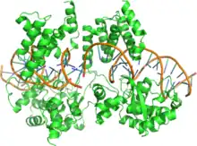 Cre recombinase is a tyrosine recombinase enzyme derived from the P1 bacteriophage. The enzyme uses a topoisomerase I-like mechanism to carry out site specific recombination events. The enzyme (38 kDa) is a member of the integrase family of site specific recombinase and it is known to catalyse the site specific recombination event between two DNA recognition sites (LoxP sites). This 34 base pair (bp) loxP recognition site consists of two 13 bp palindromic sequences which flank an 8bp spacer region. The products of Cre-mediated recombination at loxP sites are dependent upon the location and relative orientation of the loxP sites. Two separate DNA species both containing loxP sites can undergo fusion as the result of Cre mediated recombination. DNA sequences found between two loxP sites are said to be "floxed". In this case the products of Cre mediated recombination depends upon the orientation of the loxP sites. DNA found between two loxP sites oriented in the same direction will be excised as a circular loop of DNA whilst intervening DNA between two loxP sites that are opposingly orientated will be inverted.[1] The enzyme requires no additional cofactors (such as ATP) or accessory proteins for its function.[2]