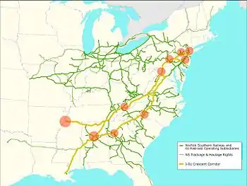 The Crescent Corridor is a railroad corridor operated by the Norfolk Southern Railway (NS). The project, first proposed in 2007, and scheduled for completion by 2020, spans 13 states from New York to Louisiana.[1][2] It is a private-public partnership between Norfolk Southern and the various state and federal governments.[2]