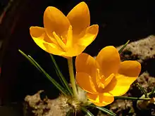Crocus ancyrensis is a herbaceous perennial geophyte growing from a corm. Plants grow 4 to 6 inches tall.[4] The corms are oval shaped with fibrous reticulated tunics. The small flowers are 1 inch long and 0.5 ince wide are orange-yellow with orange-red stigmas.[5] The flowers have bright yellow throats and typically each corm produce two or three flowers.[4] Each corm has three or four leaves which appear during flowering.[4]