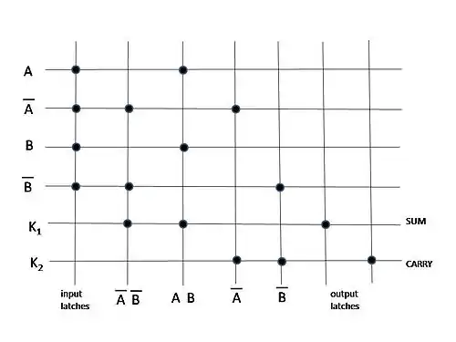 Greg Snider of Hewlett-Packard created this application, which uses crossbar latches to imitate the functionality of a half adder, which is the foundation of modern computing systems. [4] A crossbar tile is created in this application from a layer of horizontal row wires and a layer of vertical column wires, with memristor or similar materials sandwiched between the horizontal and vertical wire layers. Each crossbar tile intersection or junction can be configured to be in a high-resistance state with little or no current flowing between the horizontal and vertical wires, or in a low-resistance state with current flowing. Fig. 1 illustrates the configuration of a half-adder using a crossbar tile, as taught by Snider, with the nodes identifying junctions of the crossbar tile configured as low-resistance states. By setting different logic inputs A, NOT A, B, and NOT B to different row wires this configuration produces the sum and carry outputs typical for a half-adder. Connections between multiple half-adders may then be used to form full adders in accordance with conventional arithmetic architectures.