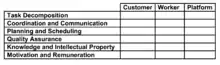 Crowdsourcing in general is a multifaceted research topic. The use of crowdsourcing in software development is associated with a number of key tension points, or facets, which should be considered (see the figure below). At the same time, research can be conducted from the perspective of the three key players in crowdsourcing: the customer, the worker, and the platform.[7]