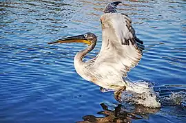 The somewhat similar-looking great white pelican broadly overlaps in size but has greater size sexual dimorphism: female great whites can be noticeably smaller than female Dalmatians but male individuals of the two species are essentially the same size and weight.[8][14] However, the Dalmatian differs from this other very large species in that it has curly nape feathers, grey legs and silvery-white (rather than pure white) plumage. In winter, adult Dalmatian pelicans go from silvery-grey to a dingier brownish-grey cream colour.[16] Immature birds are grey and lack the pink facial patch of immature white pelicans. The loose feathers around the forehead of the Dalmatian pelican can form a W-like-shape on the face right above the bill.[14] In the breeding season it has an orange-red lower mandible and pouch against a yellow upper mandible. In winter, the whole bill is a somewhat dull yellow. The bill, at 36 to 45 cm (14 to 18 in) long, is the second largest of any bird, after the Australian pelican (Pelecanus conspicillatus).[14] The bare skin around the eye can vary from yellow to purplish in colour.[17] Among standard measurements, compared to the great white pelican, the Dalmatian's tarsus is slightly shorter, at 11.6 to 12.2 cm (4.6 to 4.8 in), but its tail and wing chord length are notably larger, at 22 to 24 cm (8.7 to 9.4 in) long and 68 to 80 cm (27 to 31 in), respectively.[18][19] When the Dalmatian pelican is in flight, unlike other pelicans, its wings are solid grayish-white with black tips.[14] It is an elegant soaring bird. When a whole flock of Dalmatian pelicans is in flight, all its members move in graceful synchrony, their necks held back like a heron's.