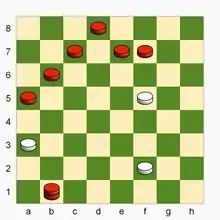 - ↑ White wins with 1. c1e3 a5:c5 2. e1c3. Black is now obligated to capture the maximum number of men (four) with the multi-jump 2... c5:c1:h1:h3:d3 and must stop on d3, since the jumped men on c3 and d1 remain on the board until the multi-jump has been completed (the already-jumped man on c3 may not be jumped more than once, and the jumped man on d1 prevents Black from jumping the man on d2). The captured men are now removed, and White proceeds with the multi-jump 3. d2:d4:d6:b6:b8+.