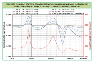 Although extremely high values of damping factor in an amplifier will not necessarily make the loudspeaker–amplifier combination sound better,[10] a high damping factor can serve to reduce the intensity of added frequency response variations that are undesirable. The figure on the right shows the effect of damping factor on the frequency response of an amplifier when that amplifier is connected to a simulated loudspeaker impedance load. This load is moderately demanding but not untypical of high-fidelity loudspeakers that are on the market, and it is based on the circuit proposed by Atkinson.[11] The audio magazines Stereophile and Australian Hi-Fi have recognised the importance of amplifier damping factor, and have made the use of the simulated loudspeaker load a routine part of their amplifier measurements. At around 4 kHz, the real-life difference between an amplifier with a moderate (100) damping factor and one with a low (20) damping factor is about 0.37 dB. However, the amplifier with the low damping factor is acting more like a subtle graphic equaliser than is the amplifier with the moderate damping factor, where the peaks and dips in the amplifier's frequency response correspond closely to the peaks and dips in the loudspeaker impedance response.[9]