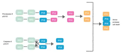 - ↑ Schleich, K.; Buchbinder, J. H.; Pietkiewicz, S.; Kähne, T.; Warnken, U.; Öztürk, S.; Schnölzer, M.; Naumann, M.; Krammer, P. H. (2016-04-01). "Molecular architecture of the DED chains at the DISC: regulation of procaspase-8 activation by short DED proteins c-FLIP and procaspase-8 prodomain". Cell Death & Differentiation. 23 (4): 681–694. doi:10.1038/cdd.2015.137. ISSN 1350-9047. PMC 4986640. PMID 26494467.