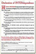 On April 8, 1944 American philosopher and historian Will Durant was approached by two leaders of the Jewish and Christian faiths, Meyer David and Dr. Christian Richard about starting "a movement, to raise moral standards." He suggested instead that they start a movement against racial intolerance and outlined his ideas for a "Declaration of Interdependence". The movement for the declaration, Declaration of INTERdependence, Inc., was launched at a gala dinner at the Hollywood Roosevelt Hotel on March 22, 1945 attended by over 400 people including Thomas Mann and Bette Davis.[3] The Declaration was read into the Congressional Record on October 1, 1945 by Ellis E. Patterson.[4]