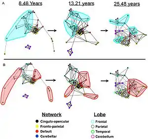 Graphs of the dynamic development of correlations between brain networks. (A) In children the regions are largely local and are organized by their physical location; the frontal regions are highlighted in light blue. (B) In adults the networks become highly correlated despite their physical distance; the default network is highlighted in light red.[22] This result is now believed to have been confounded by artifactual processes attributable to the tendency of younger subjects to move more during image acquisition, which preferentially inflates estimates of connectivity between physically proximal regions (Power 2012, Satterthwaite 2012).