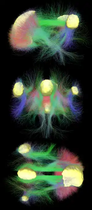Default mode network connectivity. This image shows main regions of the default mode network (yellow) and connectivity between the regions color-coded by structural traversing direction (xyz → rgb).[1][2]