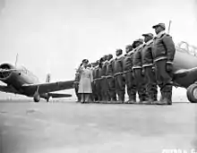 War Department tradition and policy mandated the segregation of African-Americans into separate military units staffed by white officers, as had been done previously with the 9th Cavalry, 10th Cavalry, 24th Infantry Regiment and 25th Infantry Regiment. When the appropriation of funds for aviation training created opportunities for pilot cadets, their numbers diminished the rosters of these older units.[8] In 1941, the War Department and the Army Air Corps, under pressure — three months before its transformation into the USAAF — constituted the first all-black flying unit, the 99th Pursuit Squadron.[9]