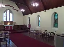 Denwick is also home to Denwick Chapel. The small gothic styled chapel, was built as a gift on the expense of Algernon George Percy, 6th Duke of Northumberland at £537.4s.0d. (approximately £205,038.07), with the foundation stone laid on 10 February 1876 by Mrs Lisle, and was built by Robertson and Sons of Alnwick and designed by George Reavell, an architect at Alnwick Castle.[9][10][11] The stone for the church is from Denwick Quarry. The church was built because villagers wanted a church in the village rather than travelling to Alnwick for services. The church has not been consecrated and is not dedicated to any saint yet does have a stained glass window of St. Anne, the mother of Mary and the maternal grandmother of Jesus.[12] Services are still held there once a month at on the second Sunday at 11.15am with services alternating between Holy Communion (Common Worship) and Morning Prayer (Book of Common Prayer).[13]