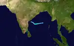 An upper-level low persisted over the Andaman Sea on November 24.[4] By the next day, a circulation center was present about 370 km (230 mi) west of Thailand, although convection was dislocated to the west due to wind shear.[14] After the thunderstorms concentrated over the center early on November 26, the IMD classified the system as a depression.[4] A ridge to the north steered the system generally westward. Outflow and convective organization gradually increased, and late on November 26 the JTWC classified it as Tropical Cyclone 03B. As the rainbands organized around the center, the winds increased; the IMD upgraded the system to a cyclonic storm on November 27, and to a severe and later a very severe cyclonic storm on November 28.[4][9]