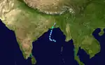 Similar to the previous storm, the active monsoon trough spawned a low-pressure area over the Andaman Sea on October 24. There was a weak center that had good outflow. On October 25, the IMD classified the system as a depression about 925 km (575 mi) southeast of Kolkata. The system moved to the northwest and developed more convection close to the center, although the thunderstorms were intermittent. Turning more to the north, the depression intensified into a deep depression and later cyclonic storm on October 27, reaching peak winds of 65 km/h (40 mph); the JTWC also classified it as Tropical Cyclone 02B. That day, the wind shear increased, although the convection was able to increase over the center and organize into a comma-shaped rainband. Early on October 28, the storm made landfall in southern Bangladesh near Mongla, by which time the wind shear had displaced much of the convection to the northeast. It rapidly weakened over land, degenerating into a remnant low over northern Bangladesh early on October 29.[4][9]