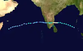 A near-equatorial trough spawned a low-pressure area on December 22 in the central Bay of Bengal. A circulation within the system developed into a depression on December 23 about 500 km (310 mi) east-southeast of Sri Lanka.[4] A low-latitude storm, the system organized while moving slowly westward.[15] On December 24, the depression strengthened into a deep depression, and the following day into a cyclonic storm,[4] the same day that the JTWC classified it as Tropical Cyclone 04B.[15] An eye developed in the center of the blossoming convection, and the system rapidly intensified into a very severe cyclonic storm on December 26. According to the IMD, the cyclone attained peak winds of 165 km/h (105 mph), and made landfall at that intensity along eastern Sri Lanka near Trincomalee around 12:00 UTC on December 26.[4] The JTWC assessed lower winds of 120 km/h (75 mph).[15] Weakening quickly over land, the storm emerged into the Gulf of Mannar on December 27 and failed to restrengthen. Later that day, it made a second landfall in extreme southern India near Thoothukudi as a cyclonic storm. Continuing westward, the system emerged into the Arabian Sea on December 28 as a depression and degenerated into a remnant low. On the next day, the remnant low merged with a trough and spread rainfall northward through India.[4]