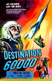Destination 60,000 (aka Jet) is a 65-minute 1957 drama film, directed by George Waggner and produced by the Allied Artists Pictures . The film stars Preston Foster, Pat Conway and Jeff Donnell. Destination 60,000 depicts the life of test pilots flying the fastest experimental supersonic fighter designs from Edwards Air Force Base.[1][Note 1]