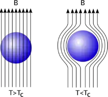 Transition from ordinary conductivity (left) to superconductivity (right). At the transition, the superconductor expels the magnetic field and then acts as a perfect diamagnet.
