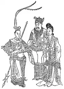 Chinese historical records indicate that Lü Bu had a secret affair with one of Dong Zhuo's maids and he constantly feared that Dong Zhuo would find out. This was one of the reasons why he betrayed and assassinated Dong Zhuo in May 192. The maid's name was not recorded, however.[1] The name "Diaochan" first appeared in Sanguozhi Pinghua as the courtesy name of Lü Bu's wife. A later zaju Duoji (now lost) explained the name, which literally means "sable cicada", as derived from the sable tails and jade decorations in the shape of cicadas which adorned the hats of high-ranking officials in the Eastern Han dynasty.[2]