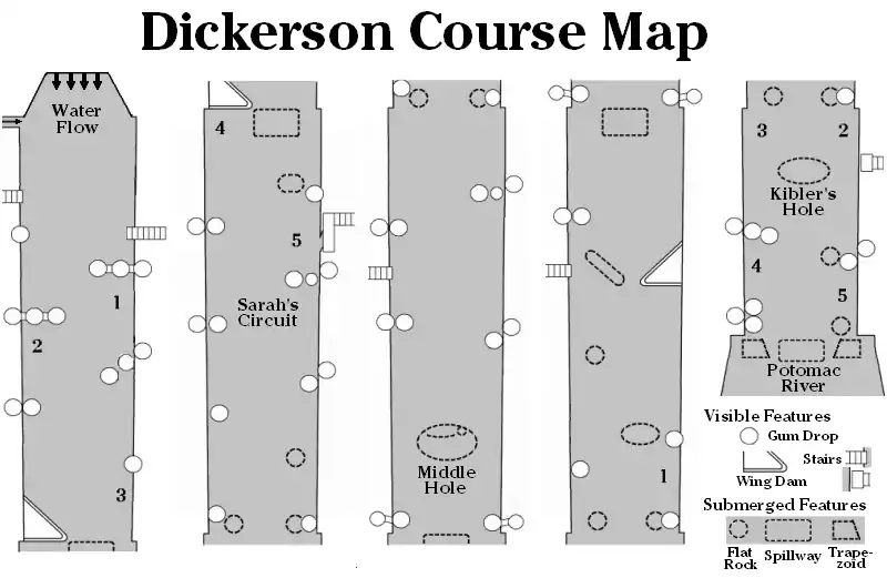 The course has four 200 ft (61 m) sections, connected in a straight line, end-to-end, with a 2-foot (0.61 m) drop at the end of each section. A final 100-foot (30 m) section ends in the river, with or without a drop, depending on the river level. Overall slope adds another seven feet of drop, for a total course drop of 15 feet (4.6 m), plus zero to four feet (0 to 1.2 meters) into the river at the end. The following map shows the arrangement of the visible and submerged features.