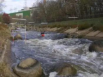Streamflow through the course is 200 cu ft/s (5.7 m3/s) to 600 cu ft/s (17 m3/s), depending on the operation of the plant's three coal-fired generators and their six cooling water pumps. In the summer months, when water temperature in the channel exceeds 100 °F (38 °C), the course is closed for health reasons.[3] It is also closed when the Potomac River rises above 5 feet (1.5 m) on the Little Falls gauge[4] 20,000 cu ft/s (570 m3/s), flooding the lower section of the course.[3]