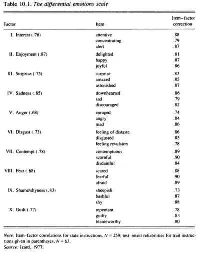 14. 1 2 Boyle, Gregory J. (1984). "Reliability and validity of Izard's Differential Emotions Scale". Personality and Individual Differences. 5 (6): 747–750. doi:10.1016/0191-8869(84)90124-7 via bepress.