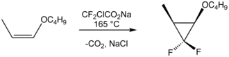 Difluorocarbene is used to generate geminal difluorocyclopropanes.
