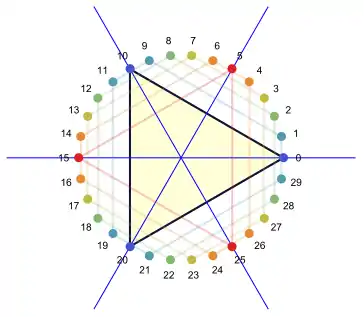 The orbits are {0, 10, 20}, {1, 9, 11, 19, 21, 29}, {2, 8, 12, 18, 22, 28}, {3, 7, 13, 17, 23, 27}, {4, 6, 14, 16, 24, 26}, and {5, 15, 25}. The points within an orbit are "equivalent". If a symmetry group applies for a pattern, then within each orbit the color is the same.