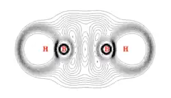 2D contour plot of electron localization function of hydrogen-substituted diphosphadiboretanediyl. Displayed plane contains both B-H bonds and is perpendicular to plane of B2P2 ring. Contour lines between B atoms indicates through-space interactions.