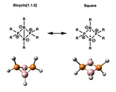 In the planar, diphosphadiboretanediyl structures, the substantially long B-B bond can be considered to experience homolytic cleavage to form a localized singlet diradicaloid between the boron atoms.[8] The singlet state energy can be up to 20-35 kcal mol−1 more stabilized than the triplet state.[9] Addition of π-donors on the boron atom is found to increase the singlet-triplet gap, while π-acceptors decrease it. The bicyclo[1.1.0] structure, with a shorter B-B bond, is considered to have less diradical character and more of a closed-shell system.[8]