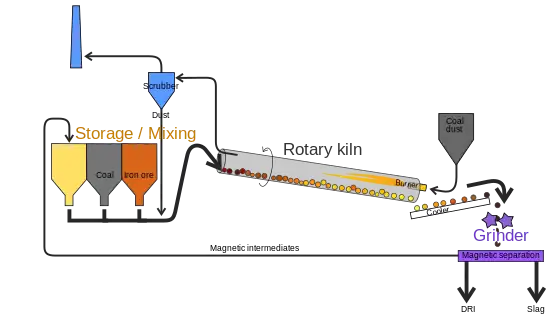 - processes where the reducing gas is obtained from coal. The reactor is generally an inclined rotary kiln, similar to those used in cement plants, in which coal is mixed with limestone and ore, then heated.