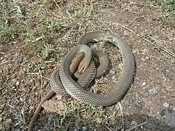 The Caspian whipsnake is perhaps the largest species of snake in Europe. It typically grows to around 140–160 cm (55–63 in) in length, though a few may exceed a length of 200 cm (79 in). The record sized specimen was approximately 250 cm (98 in)[2][3] Body mass can be commonly from 120 to 673 g (4.2 to 23.7 oz).[4] This species is not venomous and is mostly active during the day. The head is joined to the body by a thick neck. Its pupils are round. Nineteen rows of smooth scales can be found at the middle body, though rarely there may be seventeen. Dorsal scales each have two apical pits at the posterior edge. The centre of the scale is lighter in colour than the edges.[2] The dorsal side is grey-brown and features markings which are distinctive in juveniles and young snakes but fade with age. The ventral side is light yellow or white.