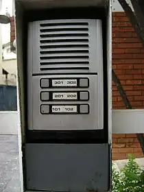 A door phone in its most basic version is a two-way intercom allowing communication from the street to the inside of a building. More complex door phones are connected to electric strikes, and can unlock and open the door to allow access to the interior of the building.[1]