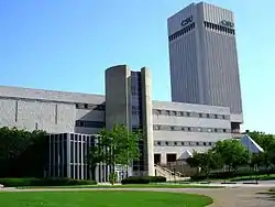 The Civic Center district holds Cleveland's governmental and public buildings. The most visible structure is the Justice Center Complex, consisting of the Cleveland Police Department headquarters and Cuyahoga County Jail.[36] Other notable structures include Cleveland City Hall,[37] Cuyahoga County and Cleveland Municipal Courts,[38] Public Auditorium,[39] Cleveland Public Library main buildings,[40] the Federal Reserve Bank of Cleveland,[41] the Howard M. Metzenbaum U.S. Courthouse,[42] and the Cleveland Metropolitan School District administration building (now occupied by the Drury Plaza Hotel).[43]