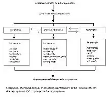 - A drainage system influences this depth; the relation between drainage system design and depth of water table is mainly physical and can be described by drainage equations, in which the drainage requirements are to be found from a water balance.[1]